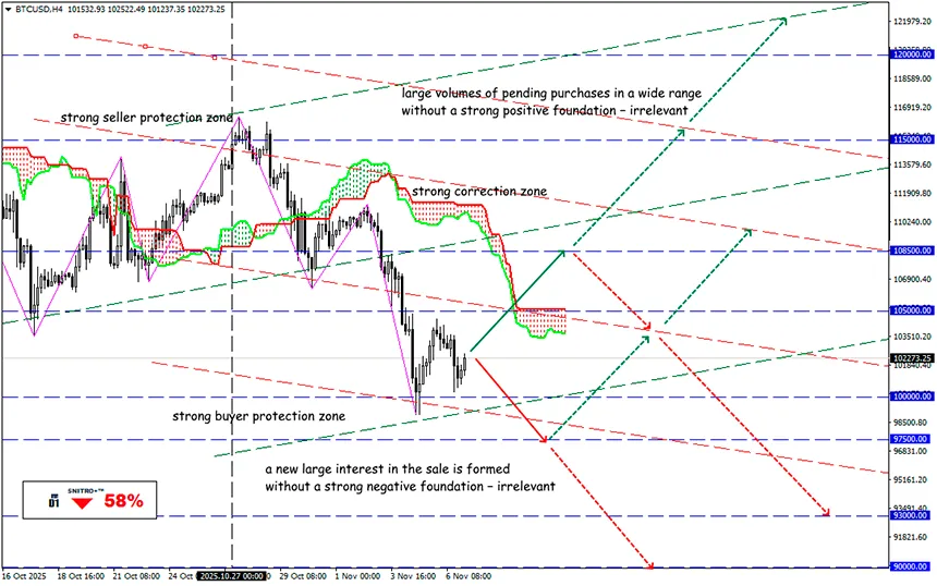 Sell: 101,500 (on a pullback after retesting the 102,500 level) ; target 97,500-96,000; StopLoss 102,500