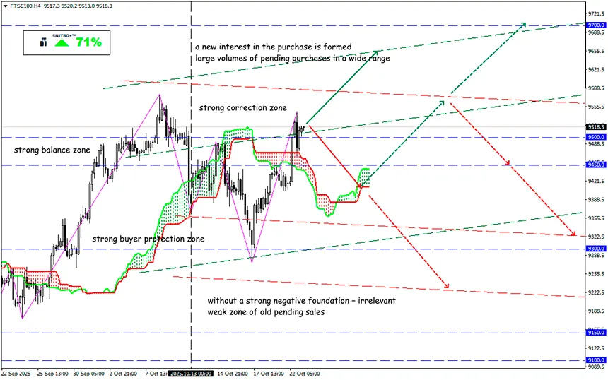 Let us recall: the FTSE 100 is a market-cap-weighted “blue chip” index of the LSE (UKX). Major British companies remain relatively undervalued compared to their U.S. counterparts, while their cash yields (dividends + buybacks) remain high. Until 2026, the yield and buyback strategy looks like a sustainable support.