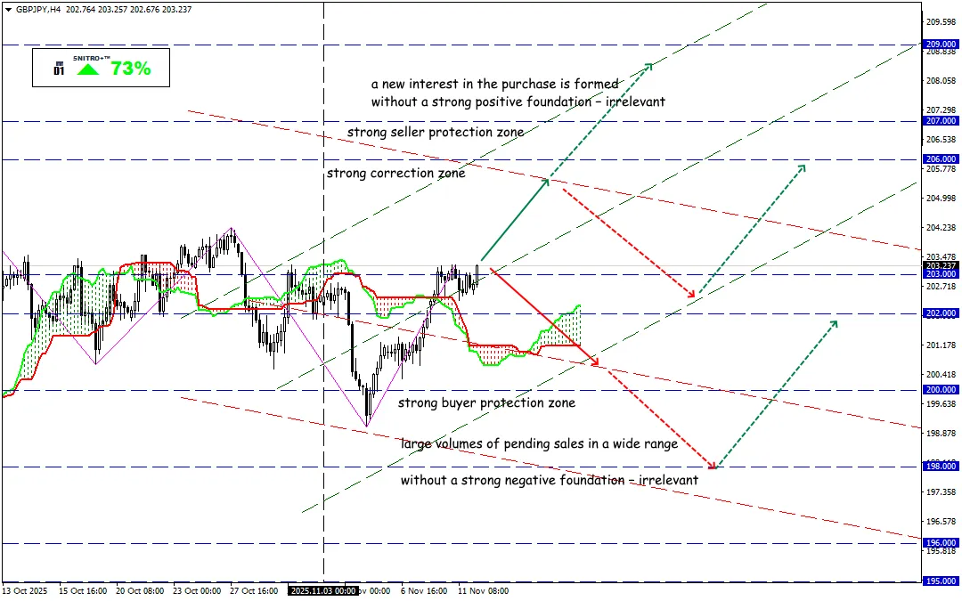 Buy: 203.50 (203.00 деңгейінде ұстап тұрғаннан кейін қайта оралу); нысана 205.00; StopLoss 202.80