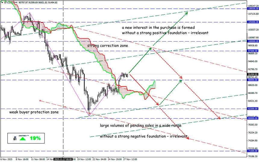 Buy: 93,500 (90 000 деңгейін қайта тексергеннен кейін) ; нысана 95,500-97,500; StopLoss 92,500